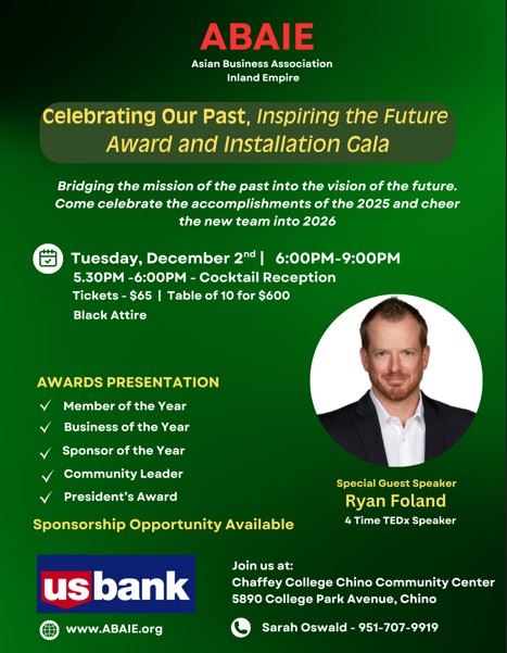 ABAIE 2025 Installation & Awards Gala The event is finished. Date Dec 02 2025 Expired! Time 5:25 pm - 9:00 pm Location Chaffey College Chino Community Center 5890 College Park Ave, Chino, CA 91710 Share this event