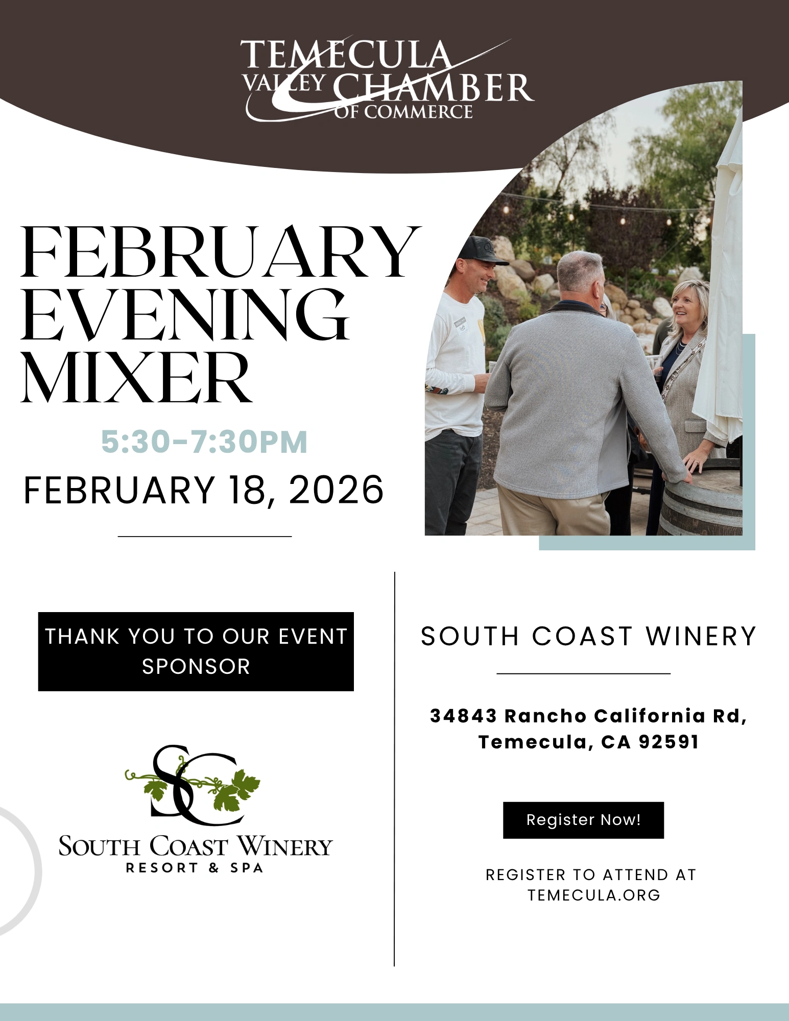 February Evening Mixer – TVCC + Add to Google Calendar + iCal / Outlook export 00 days 00 hours 00 minutes 00 seconds Date Feb 18 2026 Time 5:30 pm - 7:30 pm Location South Coast Winery 34843 Rancho California Rd Temecula, CA 92591 Share this event