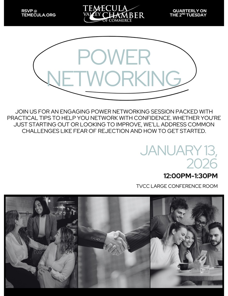 January Power Networking – Temecula Valley Chamber of Commerce + Add to Google Calendar + iCal / Outlook export 00 days 00 hours 00 minutes 00 seconds Date Jan 13 2026 Time 11:00 pm - 11:00 pm Location Temecula Valley Chamber of Commerce 26790 Ynez Court, Ste. A Temecula, CA 92591 Share this event