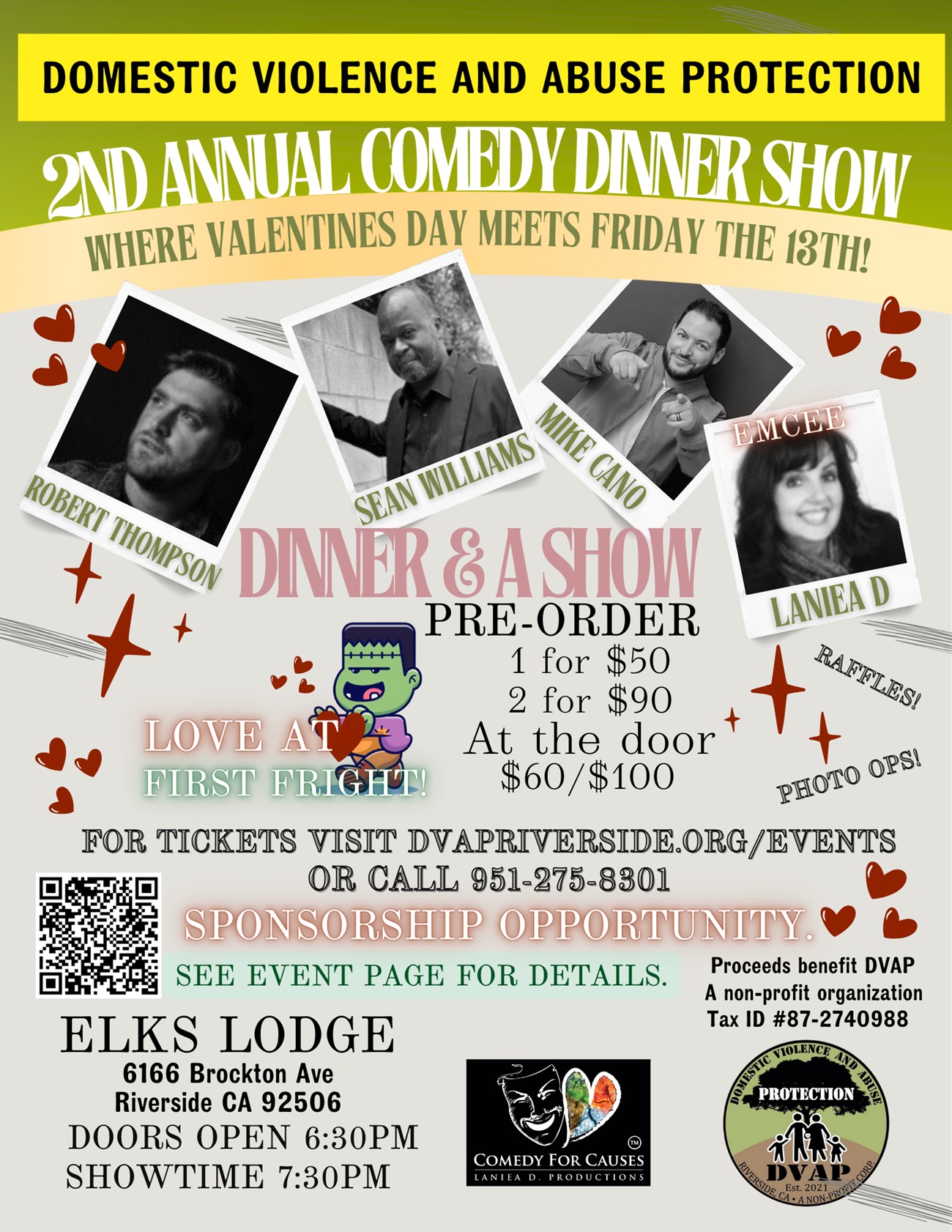 Love at First Fright: Laughing Together for DVAP + Add to Google Calendar + iCal / Outlook export 00 days 00 hours 00 minutes 00 seconds Date Feb 13 2026 Time 6:30 pm - 9:00 pm Location Elks Lodge 6166 Brockton Ave. Riverside, CA 92506 Share this event
