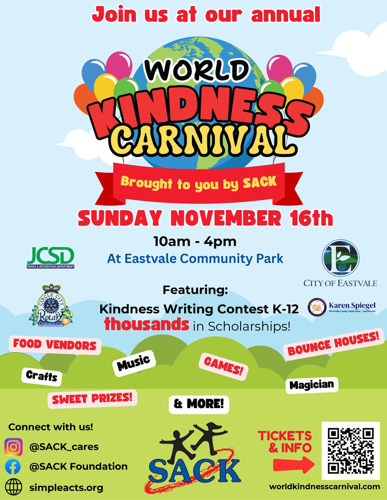 SACK & World Kindness Carnival + Add to Google Calendar + iCal / Outlook export 00 days 00 hours 00 minutes 00 seconds Date Nov 16 2025 Time 10:00 am - 4:00 pm Location Eastvale 12750 Citrus St, Eastvale, CA 92880 Share this event
